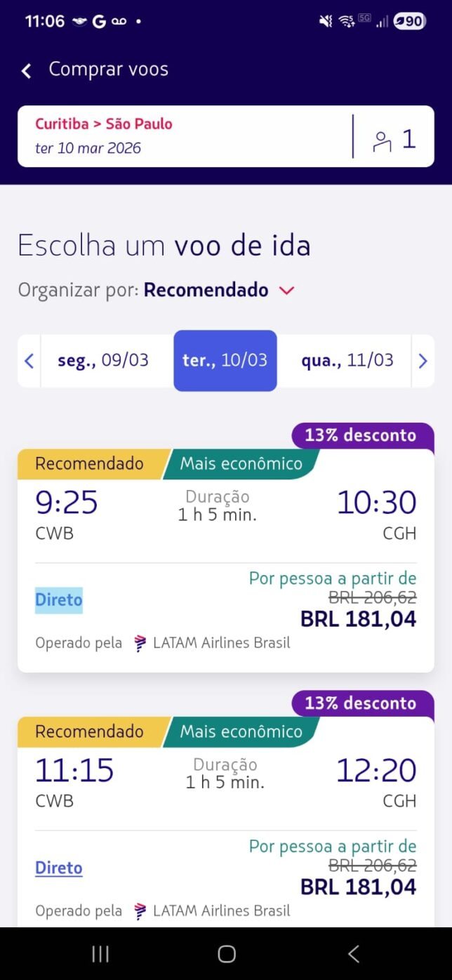 | Curitiba (CWB) → São Paulo (CGH) | R$ 181 | 13% |