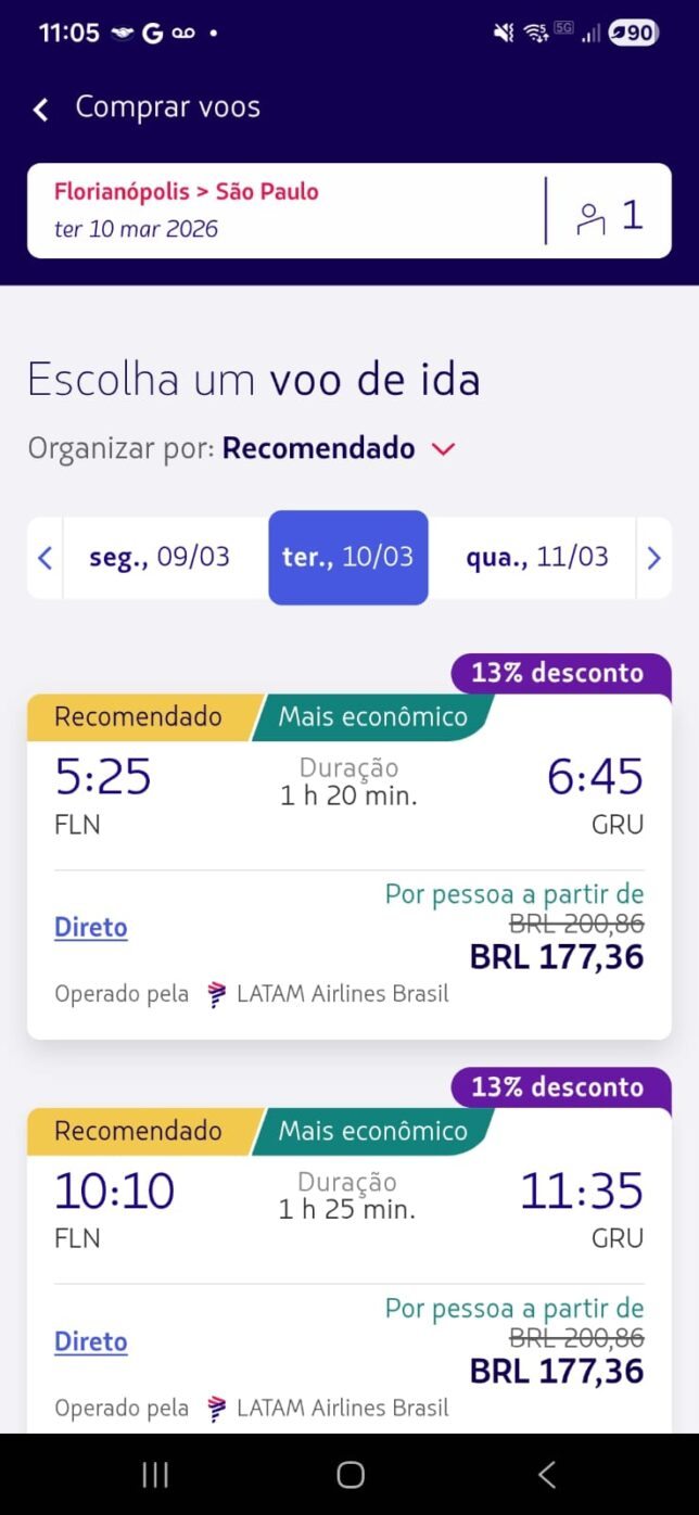 | Florianópolis (FLN) → São Paulo (GRU) | R$ 177 | 13% |