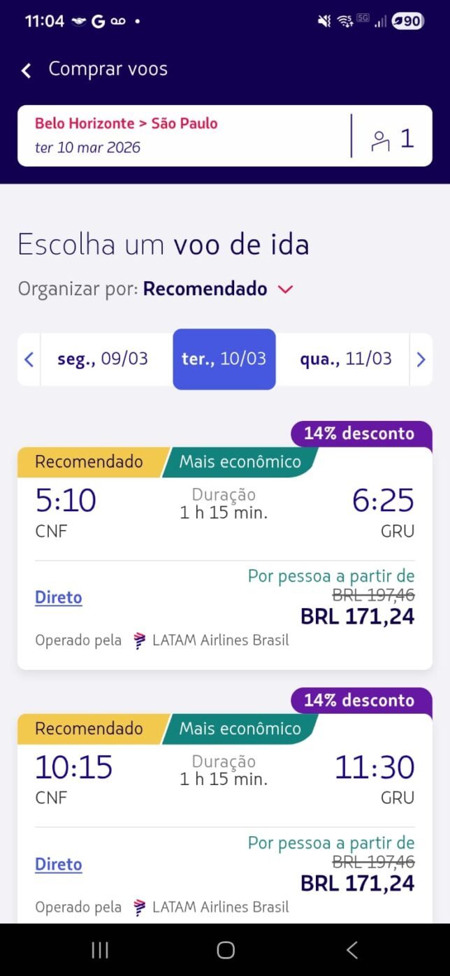 | Belo Horizonte (CNF) → São Paulo (GRU) | R$ 171 | 14% |
