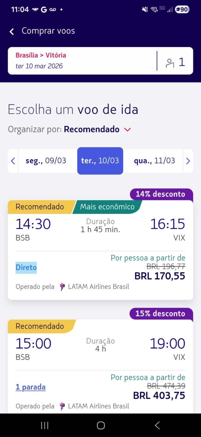 | Brasília (BSB) → Vitória (VIX) | R$ 170 | 14% |