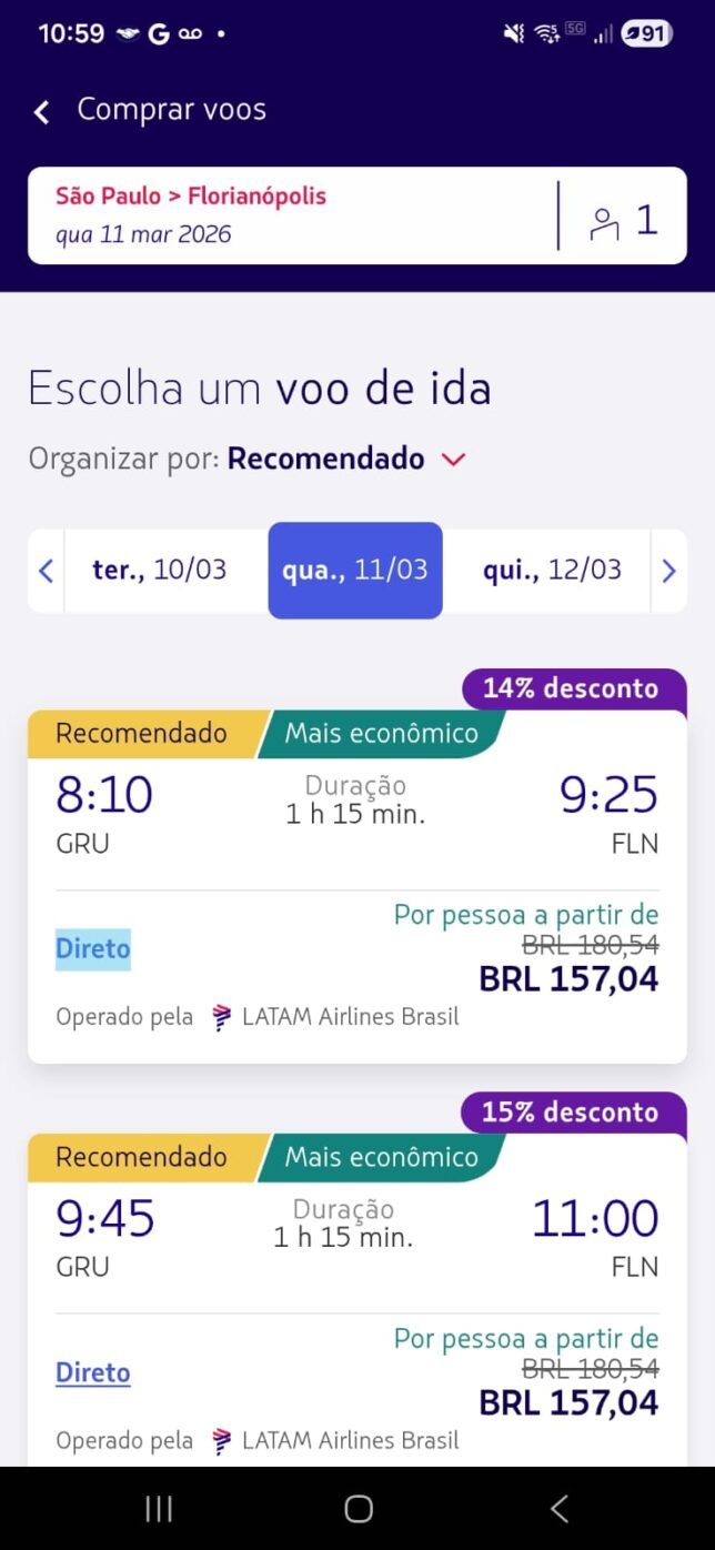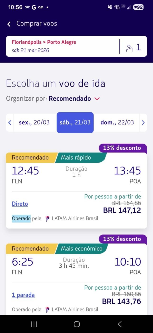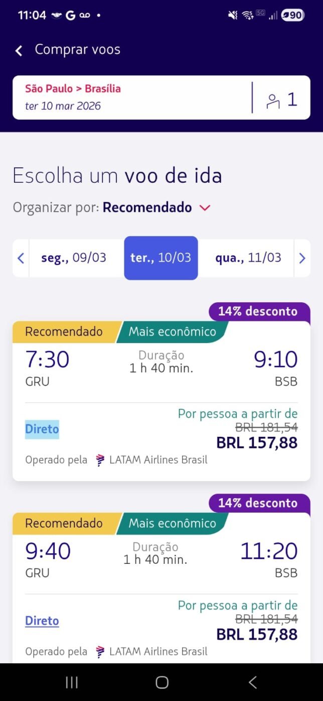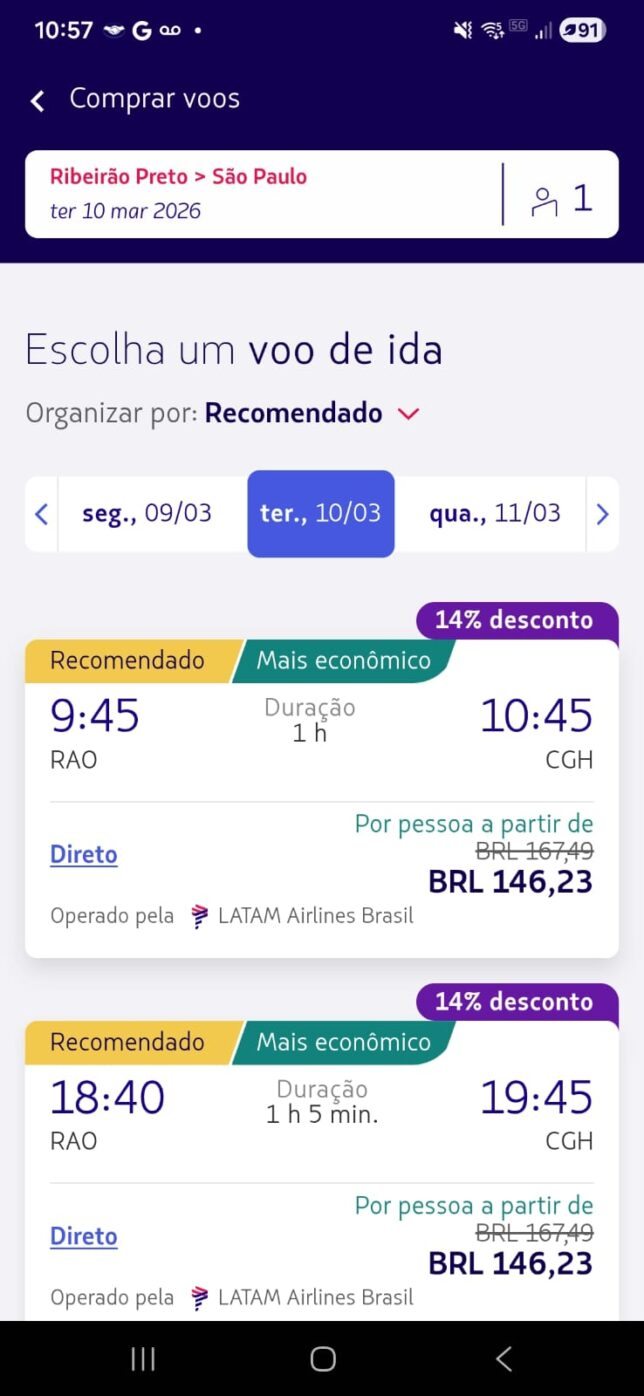 Os valores abaixo foram encontrados diretamente no app da LATAM durante o App Days, para viagens em março de 2026 (ida simples, classe econômica):