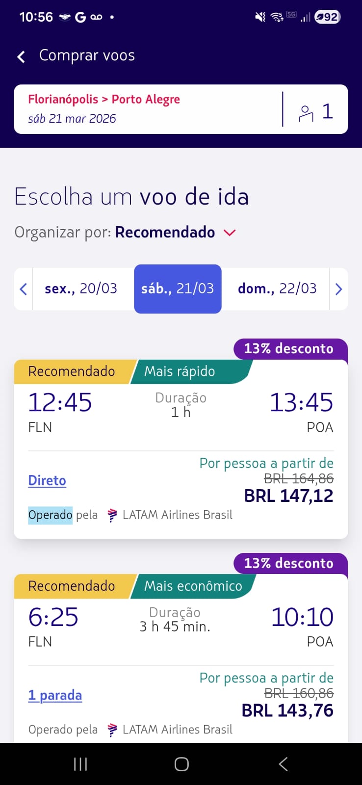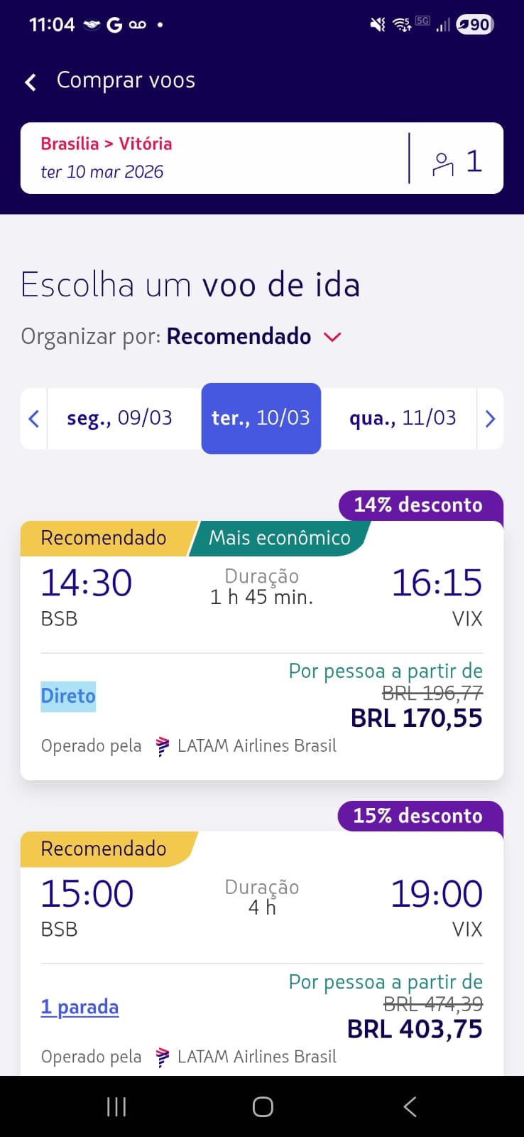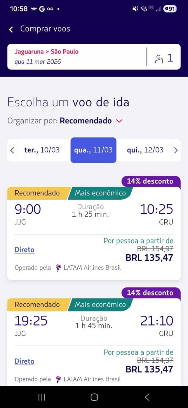 Os valores abaixo foram encontrados diretamente no app da LATAM durante o App Days, para viagens em março de 2026 (ida simples, classe econômica):