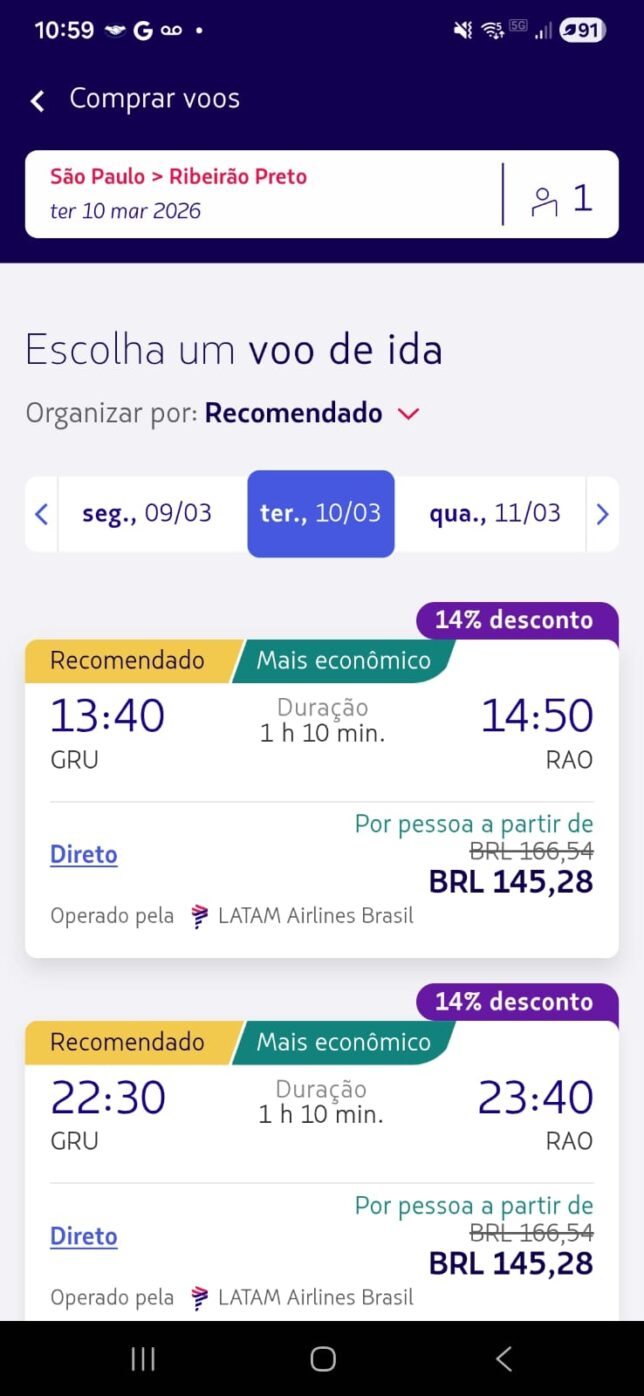 | São Paulo (GRU) → Ribeirão Preto (RAO) | R$ 145 | 14% |