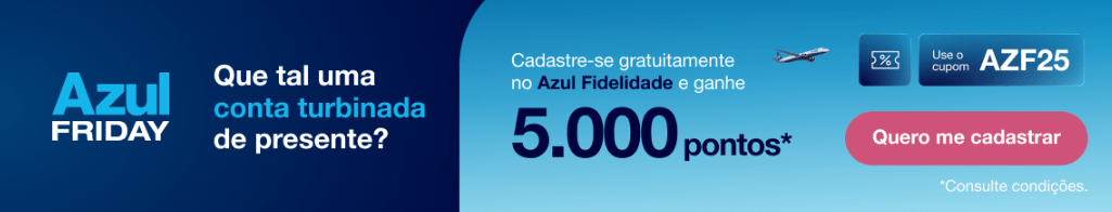 Em comemoração à Black Friday, o Azul Fidelidade lançou uma nova campanha que concede 5.000 pontos gratuitos para quem realizar o primeiro cadastro no programa. A oferta é válida apenas hoje, 27 de novembro de 2025.