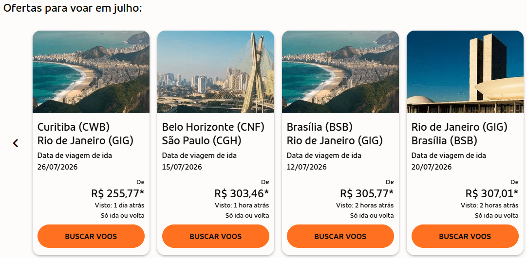 - Curitiba (CWB) → Rio de Janeiro (GIG) — 26/07/2026 — a partir de R$ 255