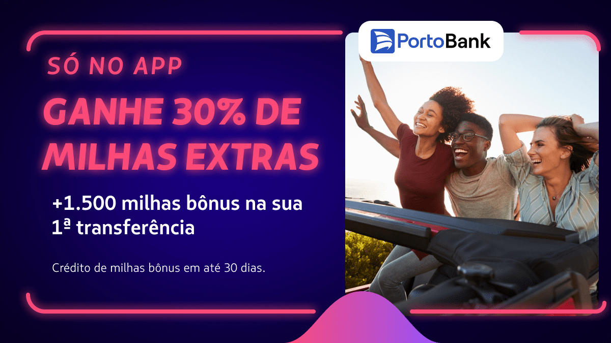 A oferta é válida para todos os clientes LATAM Pass. São 30% de milhas bônus nas transferências de pontos PortoPlus para o LATAM Pass + 1.500 milhas bônus se essa for sua primeira transferência.