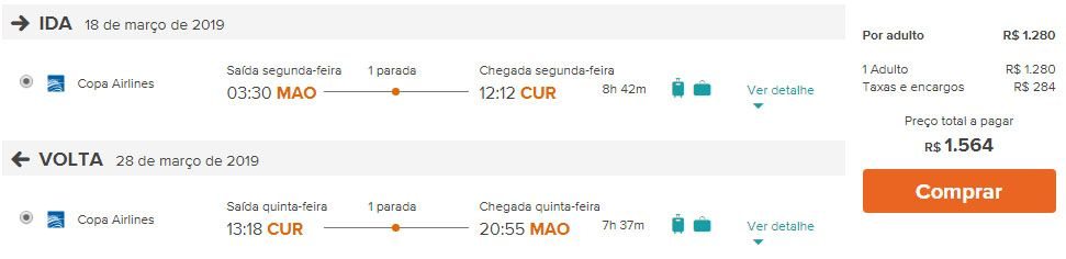 Na imagem, acima, podemos ver passagens aéreas em promoção relâmpago saindo de Manaus (MAO) para Curaçao (CUR) por APENAS R$ 1.564 ida e volta, já com taxas inclusas! SUPER BARATO! E esse é só um exemplo.