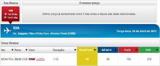 Para encontrar as passagens aéreas em promoção relâmpago não é necessário código promocional, basta realizar suas pesquisas por voos dentro do período que a promoção atende, e você irá identificar as passagens aéreas promocionais na tarifa “MegaPromo”, na cor amarelo, como mostra imagem, abaixo: