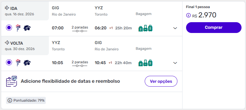 - Duração: 16h19 (ida) e 20h30 (volta)