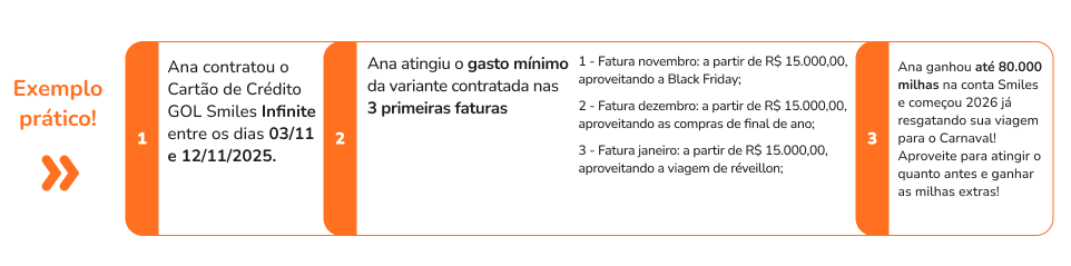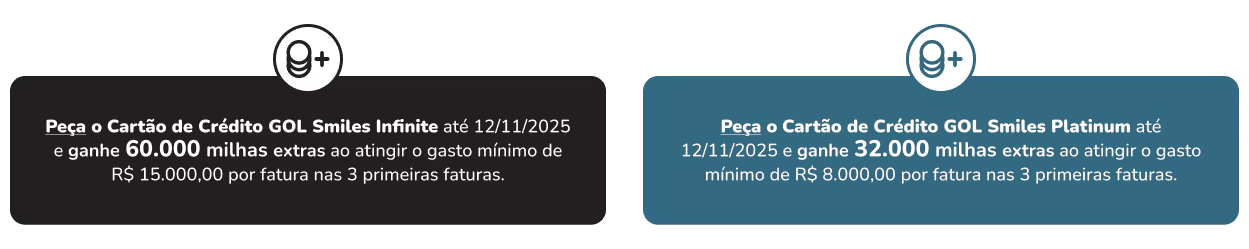 - GOL Smiles Infinite: 60.000 milhas bônus ao gastar R$ 15.000,00 por fatura durante 3 meses consecutivos (total de R$ 45.000,00).
