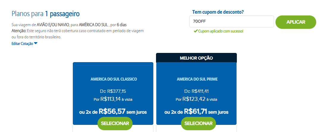 - “70OFF”: O viajante não precisará se preocupar em aplicar o cupom quando for finalizar a contratação do seguro. A aplicação é automática e feita pela própria Allianz.