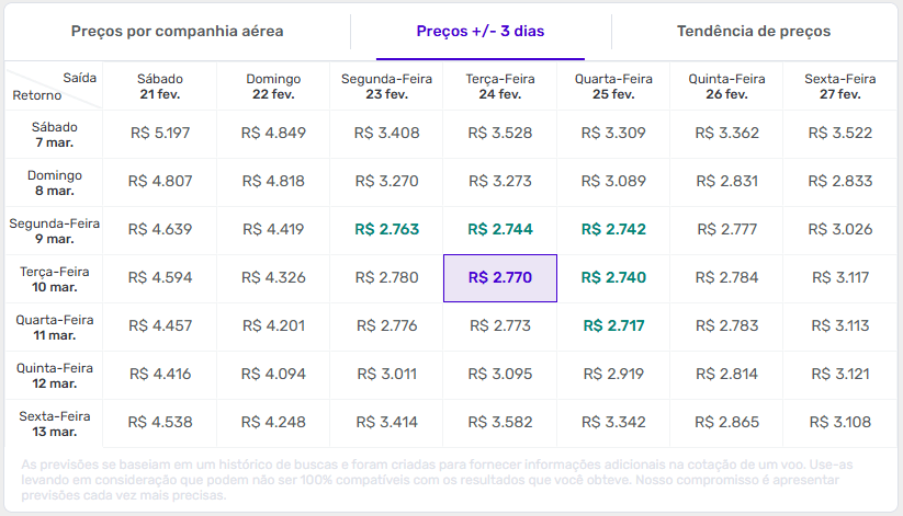 Faça sua busca e utilize a opção “Preços +/- 3 dias” para visualizar datas alternativas que podem concentrar as tarifas mais baixas.