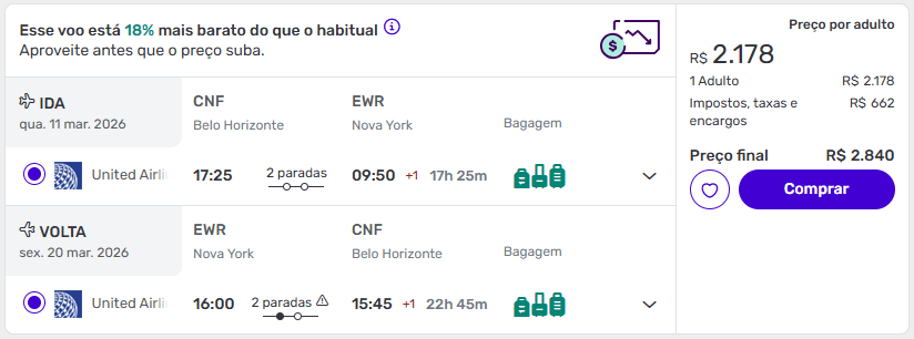 Neste sábado (24/01), identificamos tarifas de voos de ida e volta para Nova York a partir de R$ 2.740, já com taxas incluídas, em datas concentradas no fim do inverno e início da primavera no hemisfério norte.