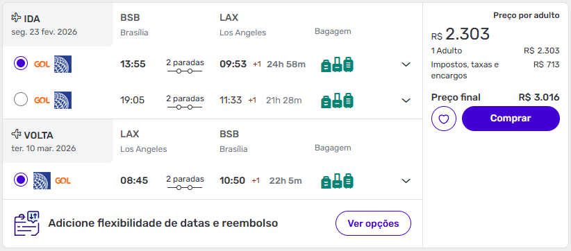 - Brasília → Los Angeles | 23 de fevereiro a 10 de março de 2026