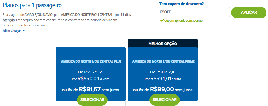 - “65OFF”: O viajante não precisará se preocupar em aplicar o cupom quando for finalizar a contratação do seguro. A aplicação é automática e feita pela própria Allianz.
