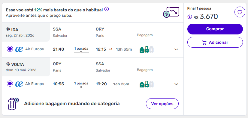 Passagens de Salvador para Paris a partir de R$ 3.670 ida e volta.