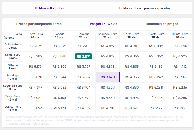 É muito fácil! Basta fazer sua busca e nos resultados clique em “PREÇOS +/- 3 dias” que um calendário com combinações de datas com as melhores ofertas será exibido.