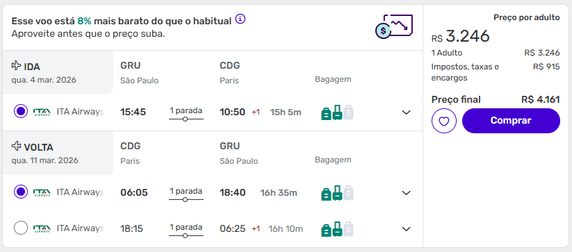 Neste momento, março e abril são os meses que estão com as melhores ofertas para embarcar para a França.