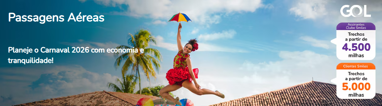 Faltando pouco mais de um ano para o Carnaval de 2026, já começam a surgir oportunidades para quem prefere planejar a viagem com antecedência — especialmente usando milhas. Levantamento de ofertas disponíveis na plataforma Smiles mostra que é possível encontrar voos nacionais a partir de 4.500 milhas por trecho, dependendo da rota e do perfil do cliente.