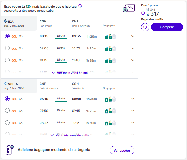 Neste momento, fevereiro e março são os meses que estão com as melhores ofertas para embarcar para BH.