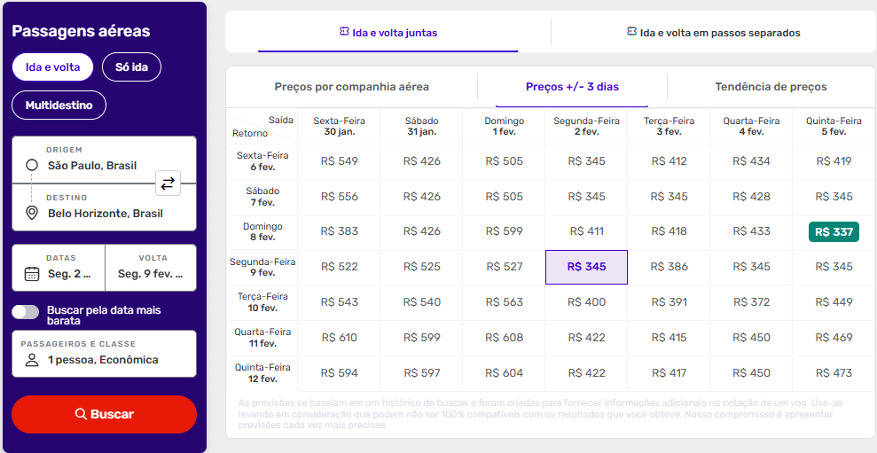 Faça sua busca e clique em “Preços +/- 3 dias” que um calendário com combinações de datas com as melhores ofertas irá se abrir.