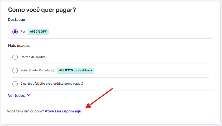 Na área de pagamento, procure por: “Você tem um cupom? Ative seu cupom aqui”: