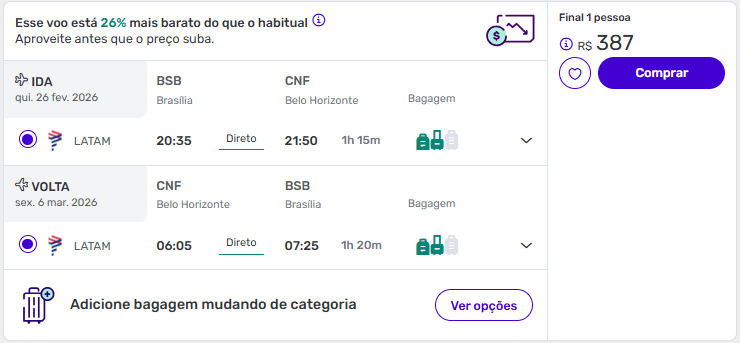 Exemplos de passagens aéreas baratas para Belo Horizonte