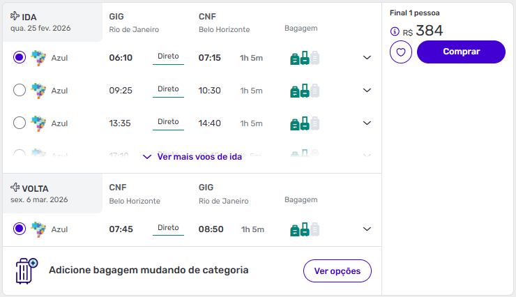 Passagens do Rio de Janeiro para Belo Horizonte a partir de R$ 384 ida e volta.
