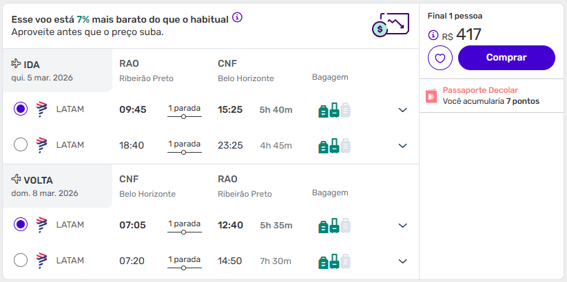 Passagens de Ribeirão Preto para Belo Horizonte a partir de R$ 417 ida e volta.