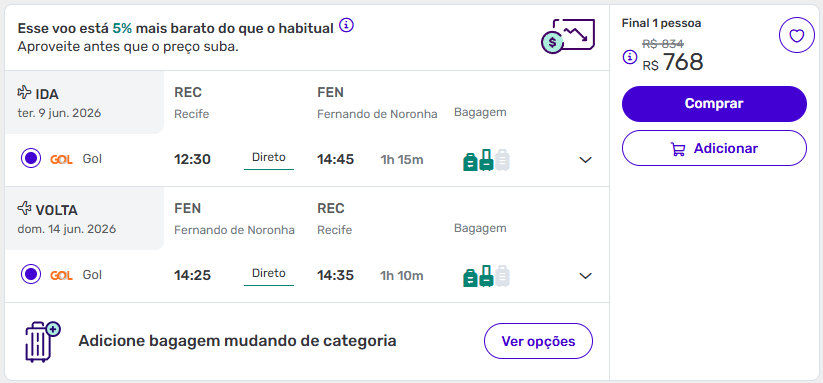Localizamos neste sábado (21), dia de promoção relâmpago na GOL, passagens aéreas para Fernando de Noronha a partir de R$ 768 ida e volta, com taxas inclusas.