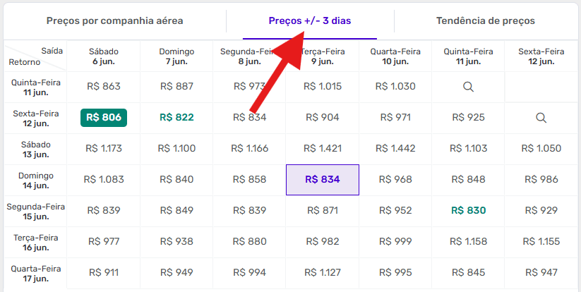 Para conferir, acesse o site da Decolar e faça sua busca normalmente, inserindo cidade de origem, destino e datas, clique em “Buscar” e na página de resultados, clique em “Preços +/- 3 dias”.