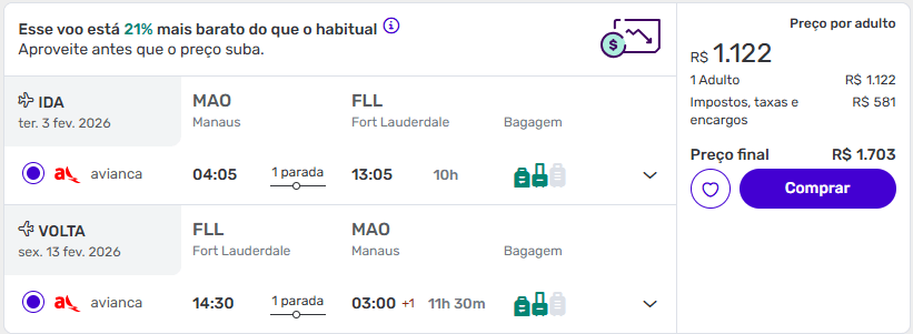 De Manaus para Fort Lauderdale a partir de R$ 1.703 ida e volta.