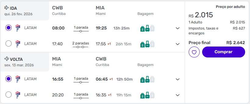 De Curitiba para Miami a partir de R$ 2.642 ida e volta.