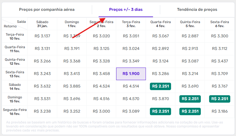 Faça sua busca e clique em “Preços +/- 3 dias” que um calendário com combinações de datas com as melhores ofertas irá se abrir.
