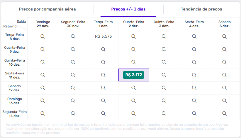 Faça sua busca e clique em “Preços +/- 3 dias” que um calendário com combinações de datas com as melhores ofertas irá se abrir.
